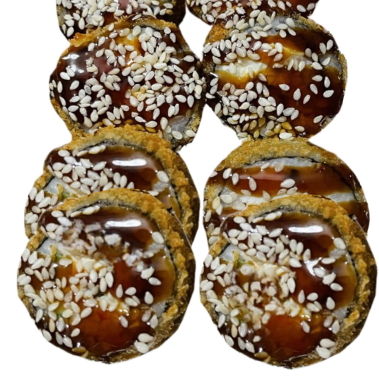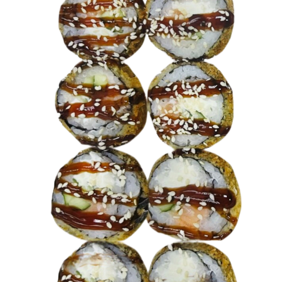 Креветка, огурцы, сыр сливочный, соус унаги, кунжут, рис, нори.