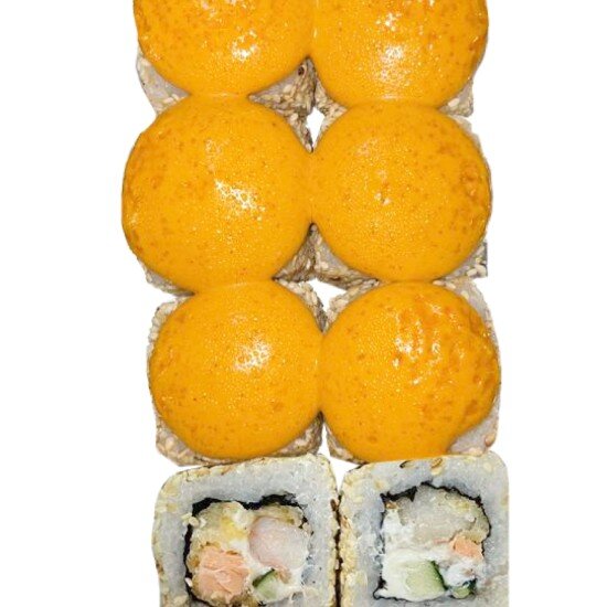 Лосось, огурцы, сливочный сыр, икра масаго, соус спайси, рис, нори.