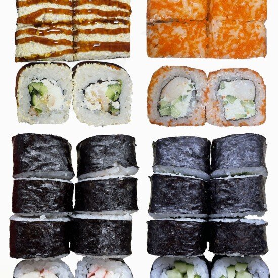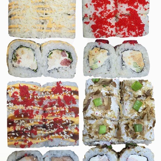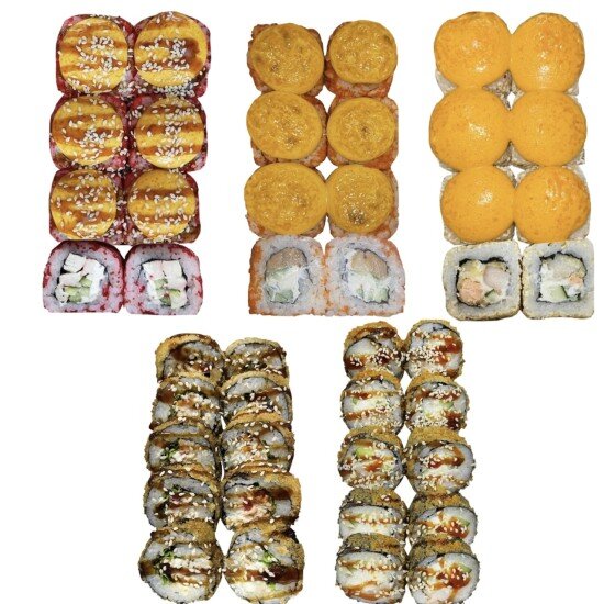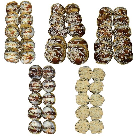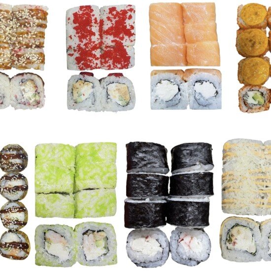 (соевый соус, васаби, палочки, имбирь на 3 персоны) Ролл «Канада» (угорь, огурцы, сливочный сыр, соус унаги, кунжут, рис, нори), ролл «Филадельфия» (лосось, сыр сливочный, рис, нори), ролл «Запечённый с лососем» (лосось, огурец, авокадо, сливочный сыр, соус спайси, рис, нори), ролл «Запечённый с креветкой» (креветка, огурец, авокадо, сливочный сыр, соус спайси, рис, нори).