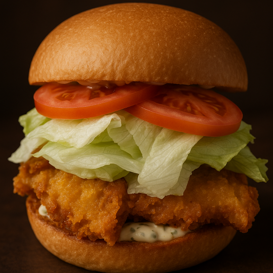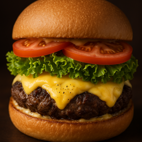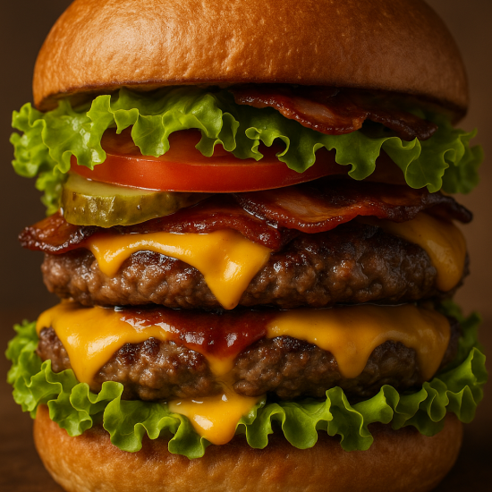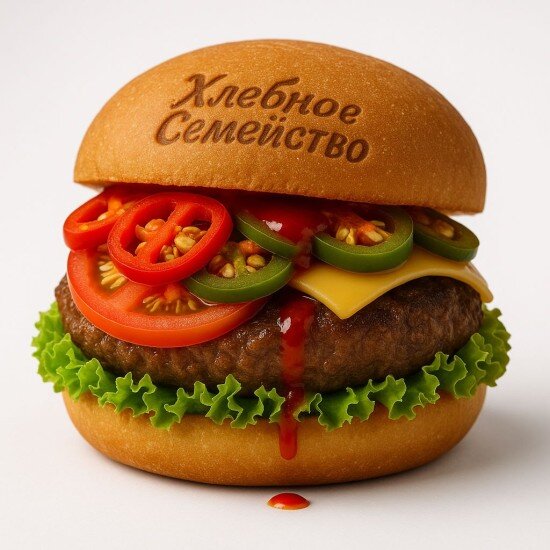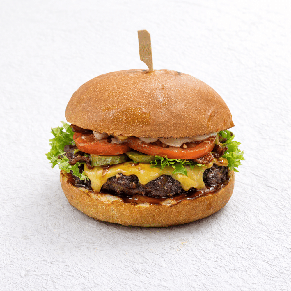 Котлета из мраморной говядины, лист салата, сыр чеддер, помидоры, огурцы соленые, бекон, соус BBQ, соус бургер