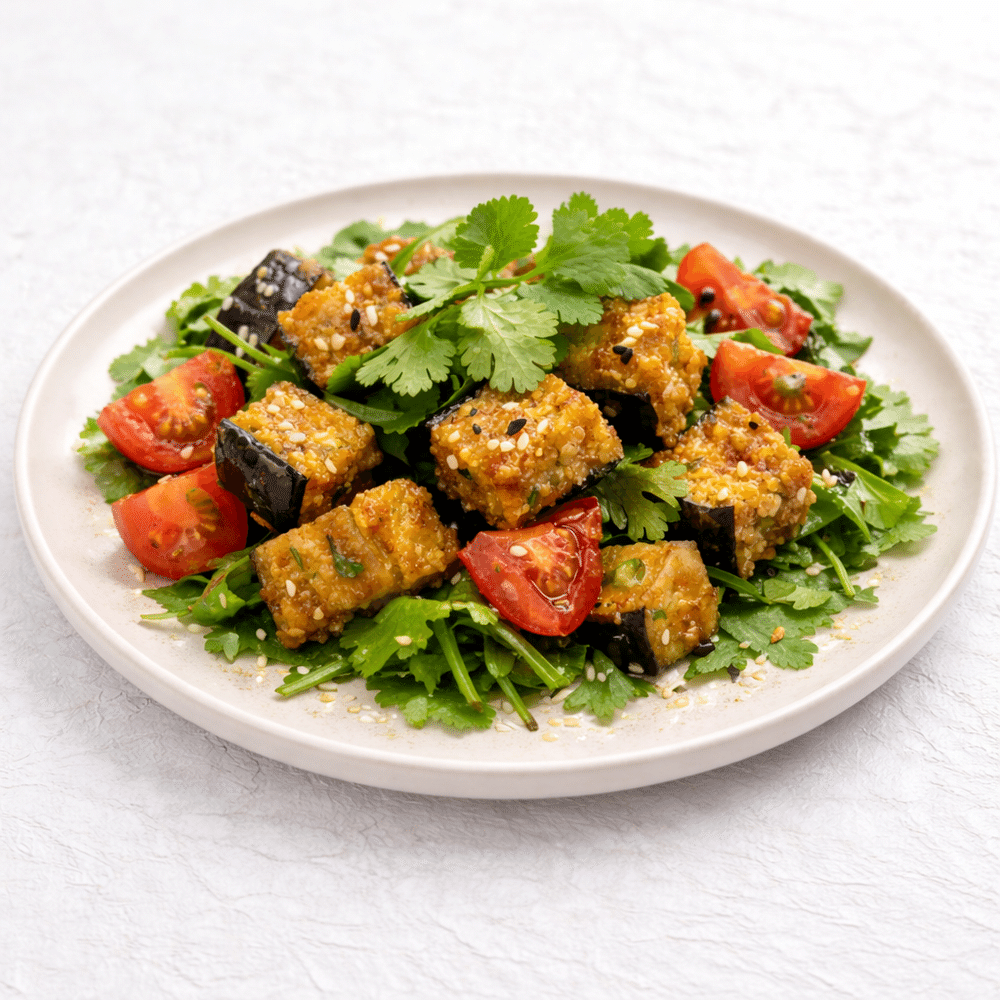 Баклажан в хрустящей панировке, микс салата, помидор, кунжут, кинза, фирменная заправка