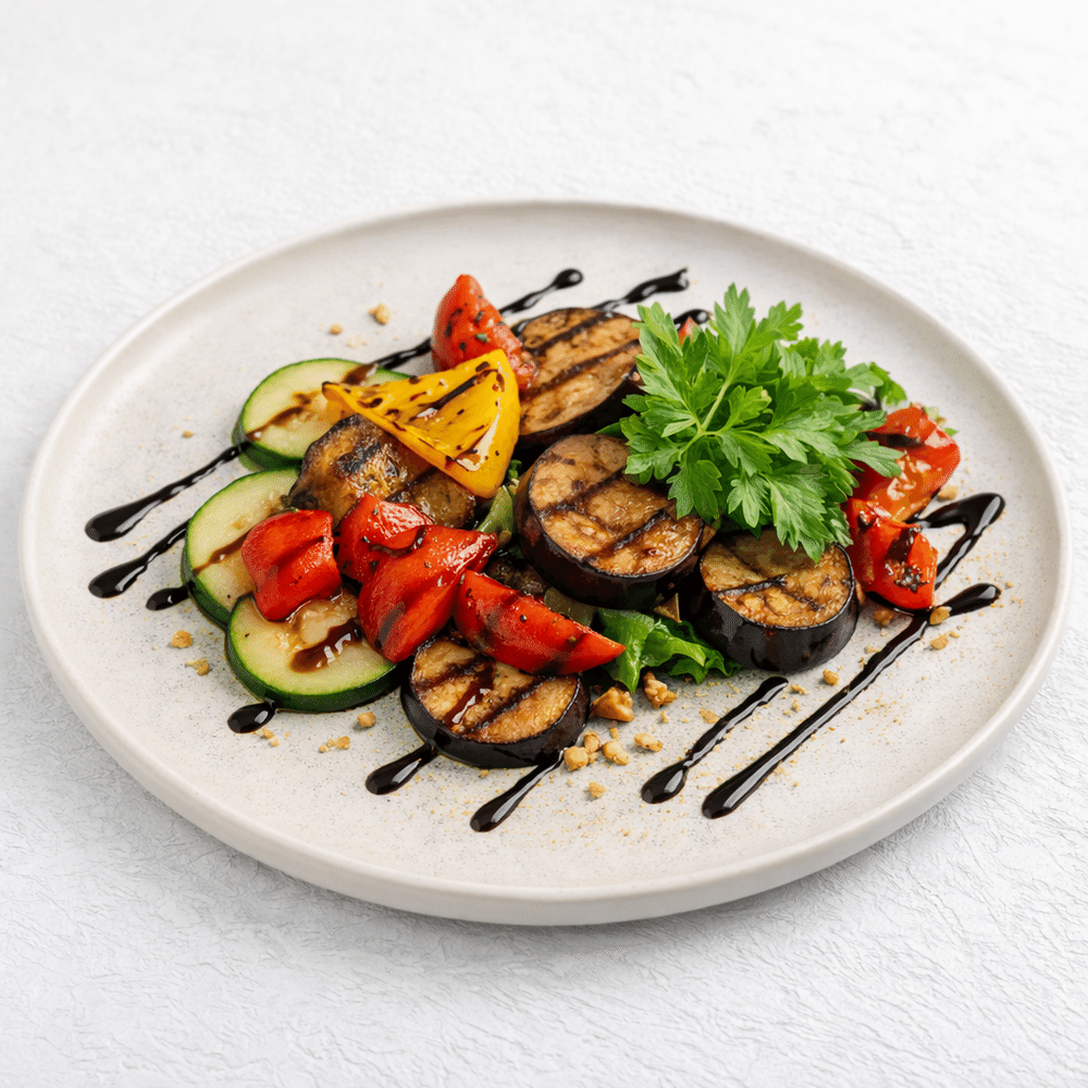 Баклажан, цукини, перец болгарский, помидор, лук красный, орех грецкий, кинза, фирменная заправка