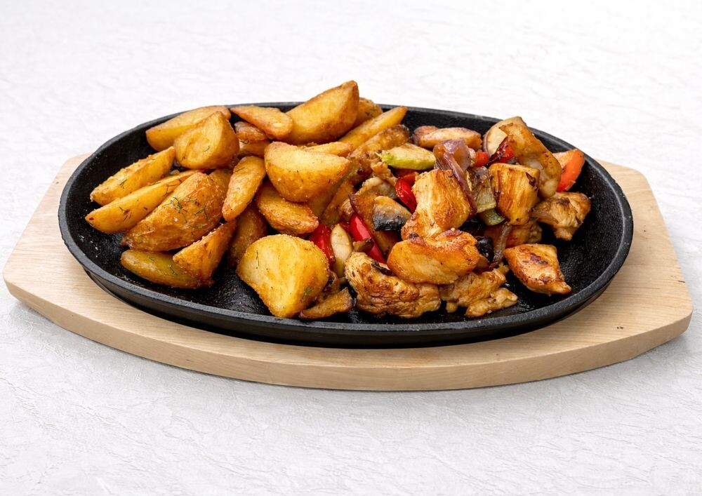 Курочка, картофель, цукини, лук красный, шампиньоны, перец болгарский