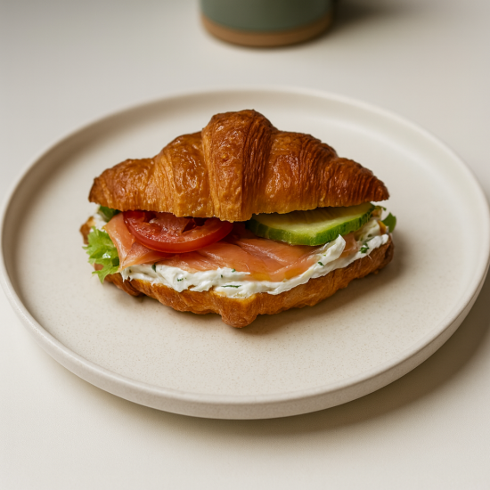 Тёплый хрустящий круассан, копчёная говядина, горчичная заправка, лист салата, огурец, помидор